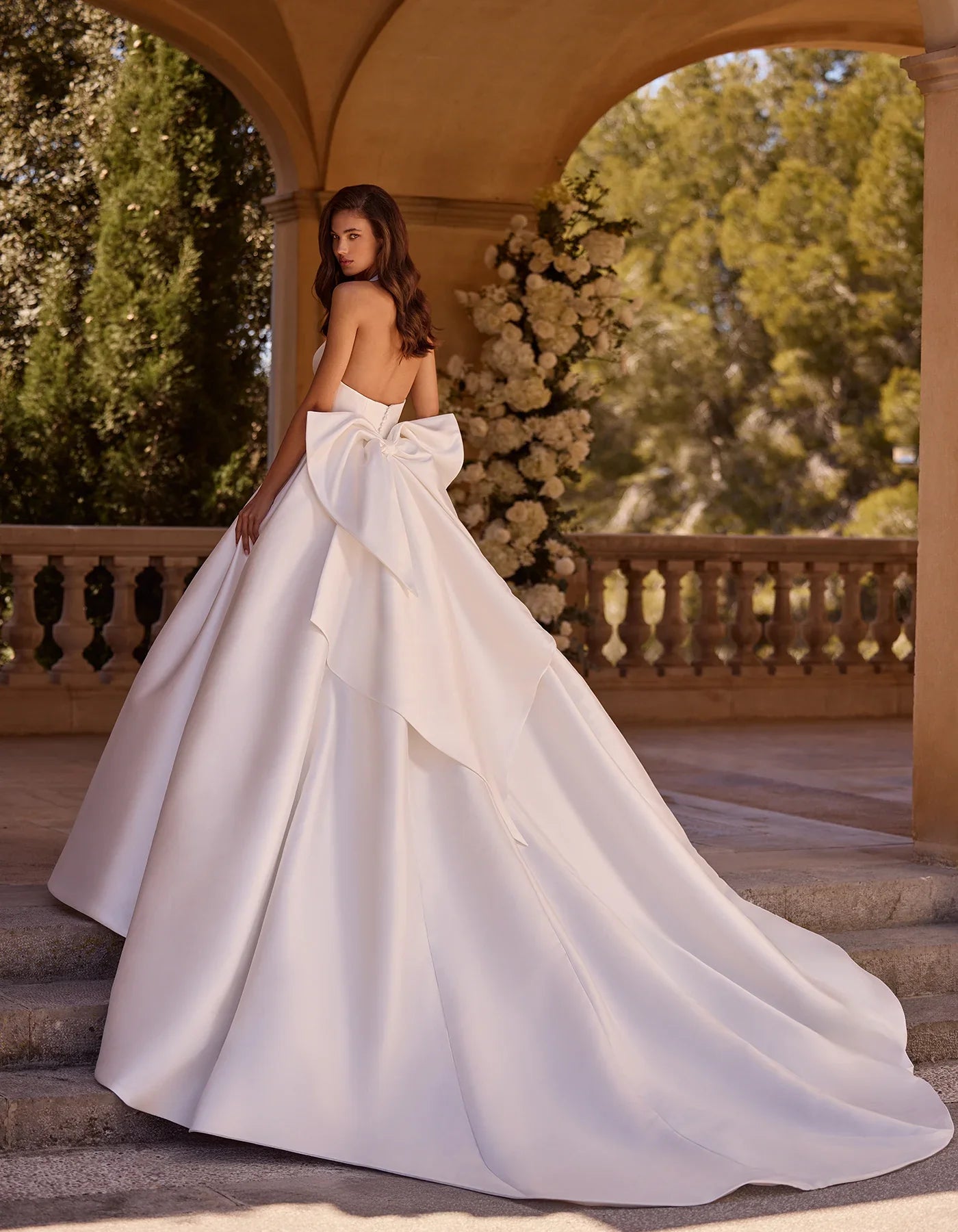 Brautkleid im Prinzessinnen-Stil aus Mikado mit V-Ausschnitt, langer Schleppe und eine große abnehmbare Schleife aus Mikado.