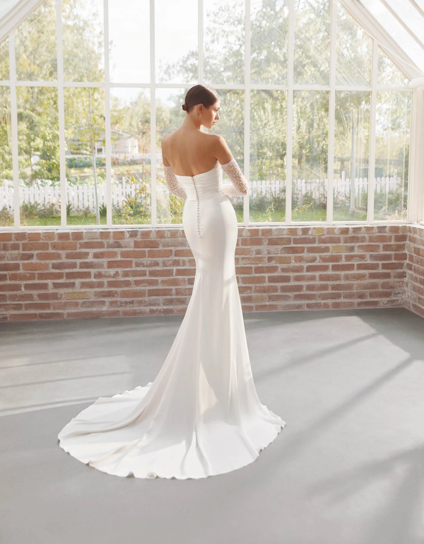 Brautkleid im Meerjungfrauen-Stil aus seidigem Satin gefertigt, drapierter Bustier-Ausschnitt mit Perlenverzierung.