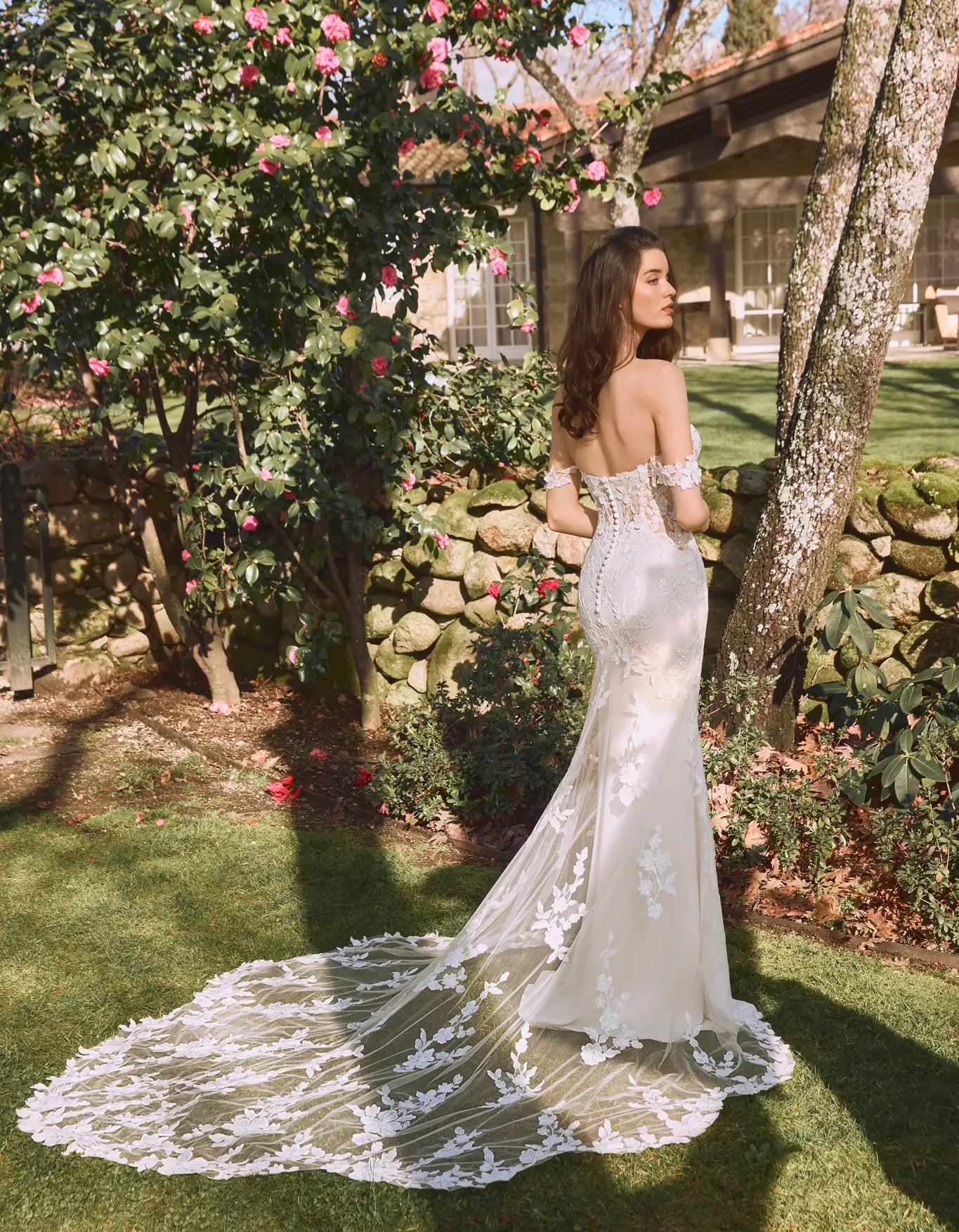 Klassisches Meerjungfrauenkleid mit aufwendigen Stickereien und zarten Blumenmotiven, die sich über das Oberteil ziehen und eine entzückende Transparenz erzeugen.